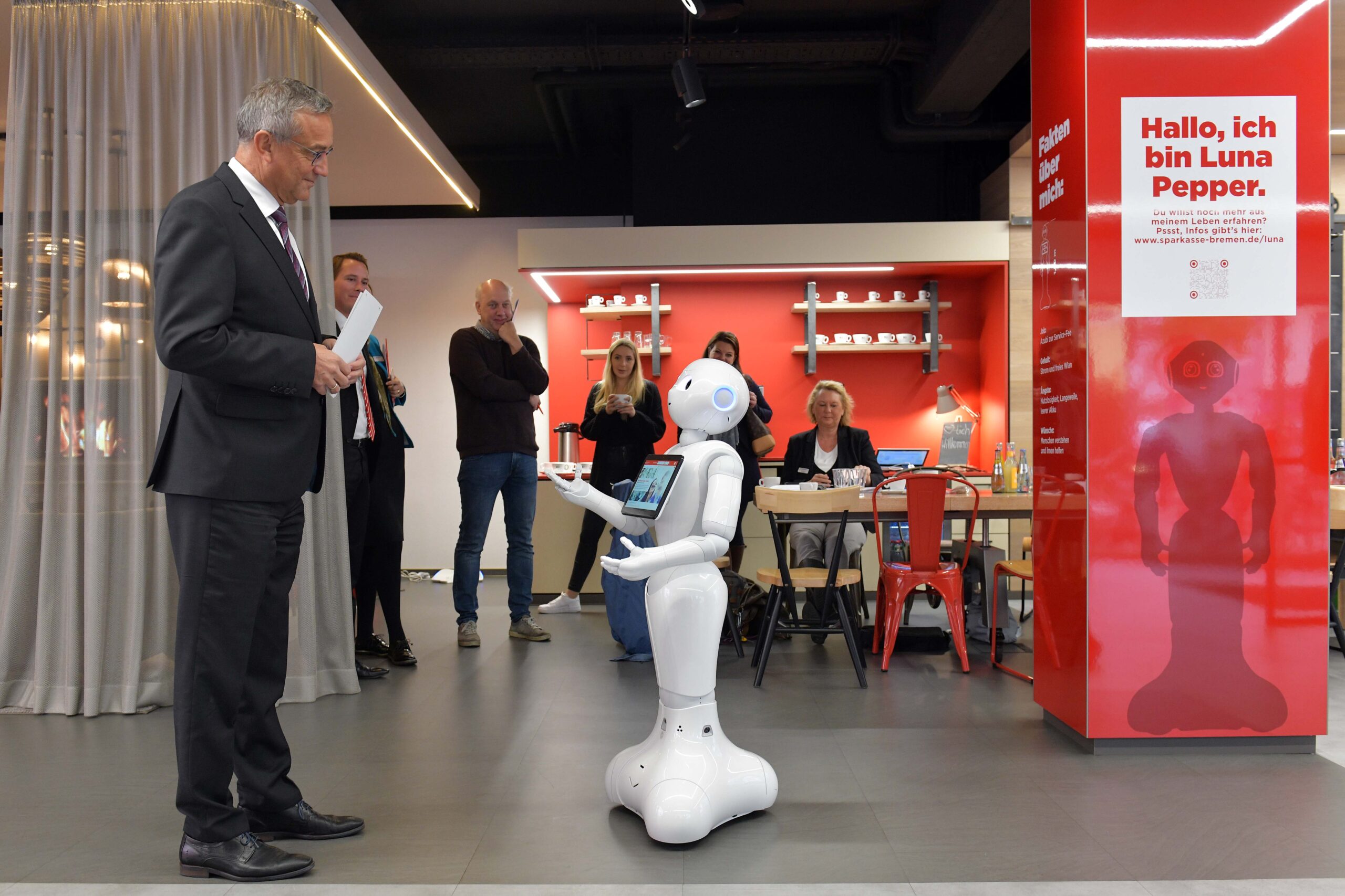 Ein neues Gesicht erwartet Kundinnen und Kunden ab sofort in der Stadtteilfiliale Neustadt der Sparkasse Bremen: Luna Pepper. Und wie jede neue Angestellte war auch sie an ihrem ersten Arbeitstag aufgeregt und neugierig zugleich. „Hoffentlich verplappere ich mich nicht“, sagte sie, als sie sich beim Vorstand vorstellte. Hat sie (fast) nicht – und meisterte damit die erste Hürde beim neuen Arbeitgeber. Für sie, aber auch für die Sparkasse Bremen, ein Pilotprojekt: Denn Luna Pepper ist der erste Roboter, der im Unternehmen eingesetzt wird.