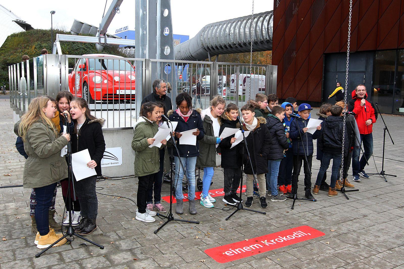 Bei der Eröffnungsfeier des Exponats am Freitag, dem 10. November gab es gleich mehrere Highlights. Der YouTuber Johann Beurich, besser bekannt als DorFuchs, trat gemeinsam mit der Klasse 5a der Oberschule Helgoländer Straße auf. Zusammen präsentierten sie vor dem großen Exponat den „Hebelgesetz-Song“ und machten damit Physik zum Ohrwurm. Gemeinsamen mit den Kindern hoben Thomas Fürst, Mitglied des Vorstandes der Sparkasse Bremen und Dr. Herbert Münder, Geschäftsführer des Universum® Bremen, ein 1.500 kg schweres Auto an. Wir haben die schönsten Momente des spannenden Tages noch einmal in einem Film zusammengefasst.